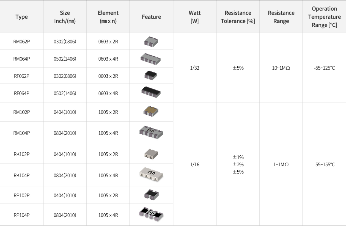 可以1个产品代替4个或2个单品电阻,与使用多个单品时相比,可减小安装面积。可减小安装次数,减少安装实践和费用,SMT 生产效率提升效果显著,因此其使用范围逐渐扩大。Array Resistor主要用于半导体企业,其质量和性能备受认可。