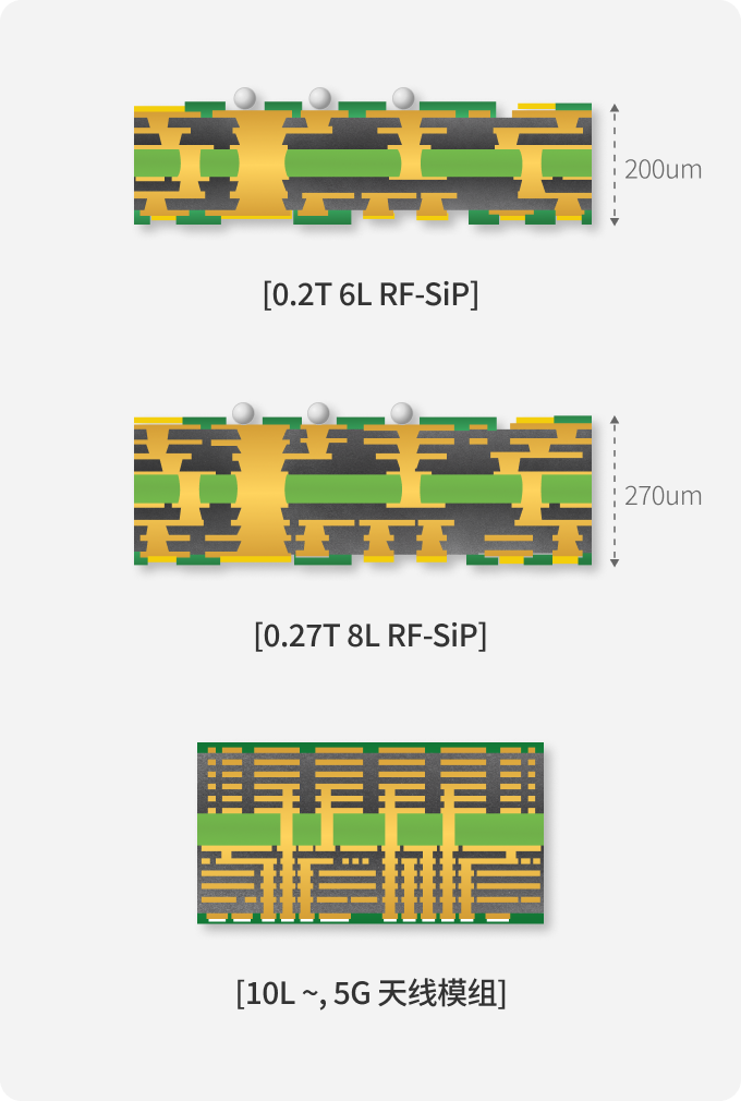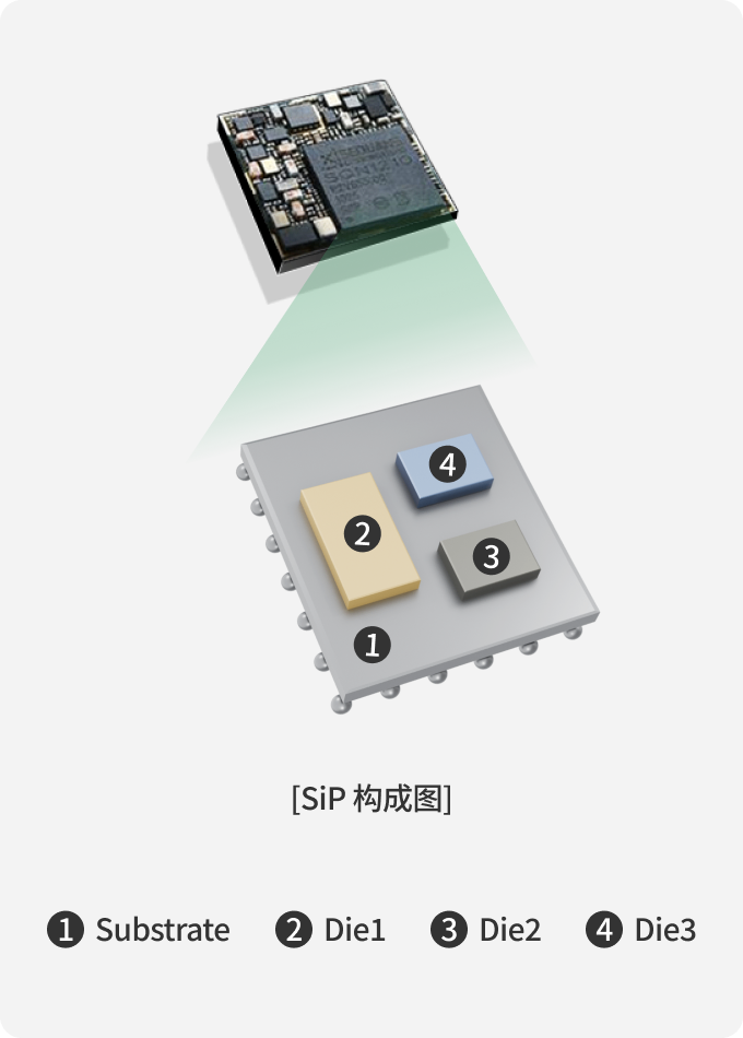 Package 内装有多个 IC和 Passive Component,是一款将综合功能呈现为一个 System的产品。另外还用于 PA(Power Amplifier)等产品中,具有散热特性。产品系列包括 Flip-Chip SiP和 Coreless。
